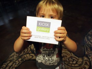 We asked artists in Kansas City and beyond to make editions of their art to be shuffled and stacked into sets of artist trading cards, and we displayed a few from each set on the walls at Kiosk.