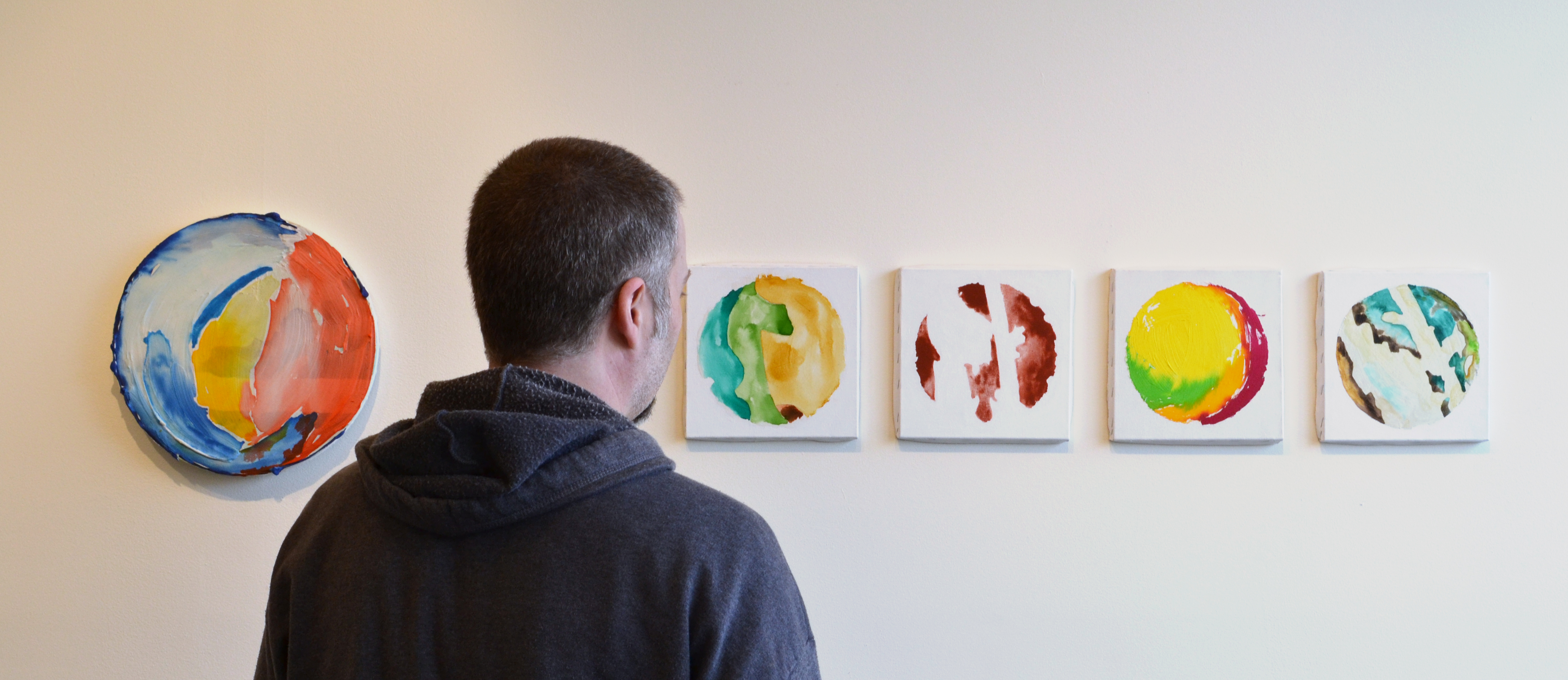 The work is displayed in the gallery in a loose timeline. DeSitter began with sketches in ink inspired by fragmented ice formations on the Missouri river; and moved to the small cards and paintings influenced by images she captured with a microscope view accessory on her phone’s camera; to the most recent iterations of her explorations: a planetary orb growing from a piece of plywood.