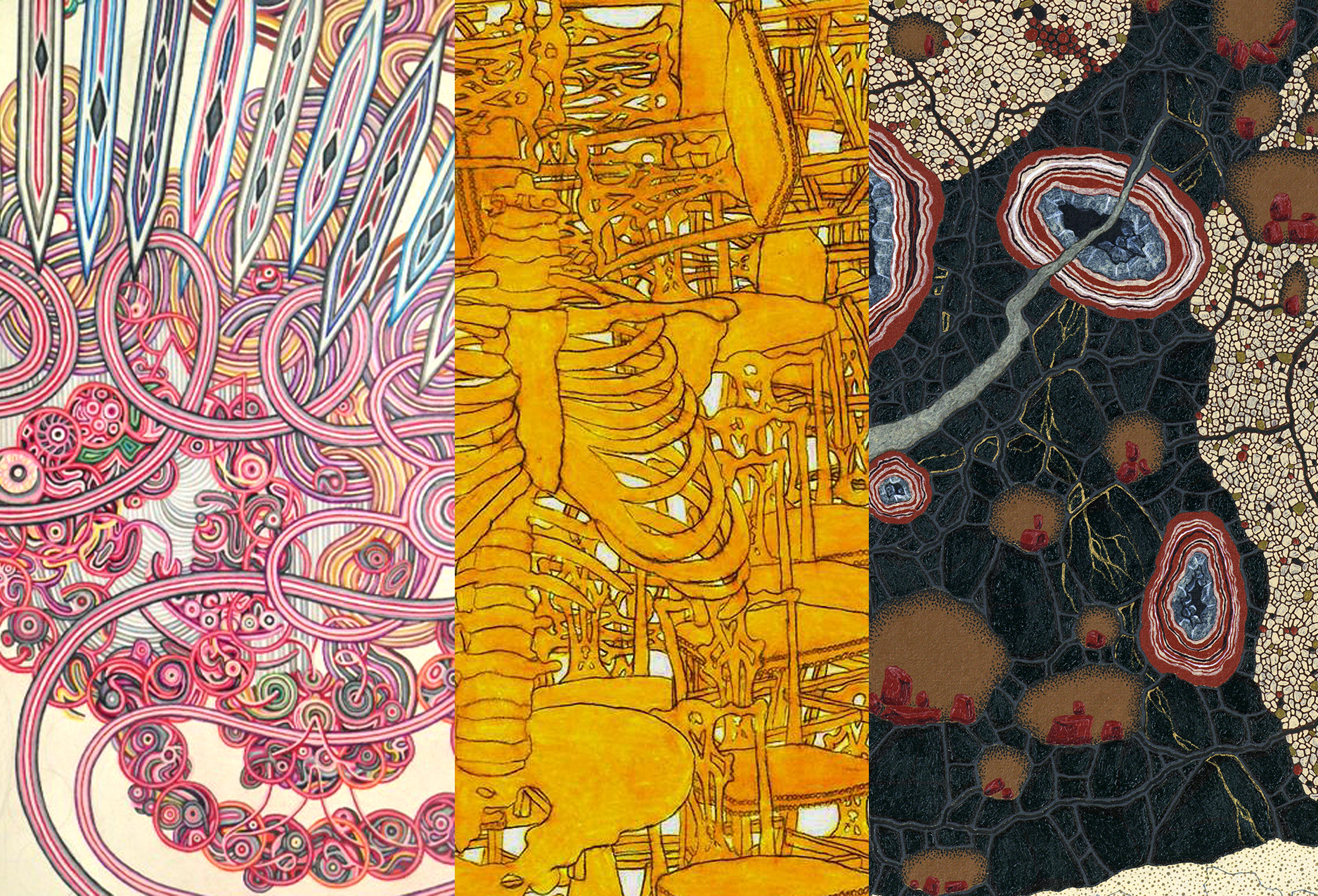 On 3rd Friday in May, Kiosk Gallery presents “Fixate” – an exhibition of drawings and paintings by Alex Heilner (VA), Cotter Luppi (NY), and Amy Wright (KCMO). These 3 artists work persistently in detailed, cumulative styles that highlight repeated elements and intricately rendered images – fetishizing their subjects (both sincerely and critically). An artist’s reception will be held May 20th, 6-9 pm. The show runs through June 9th, open Fridays 12-6 pm, Saturdays 12-4 pm, and by appointment.