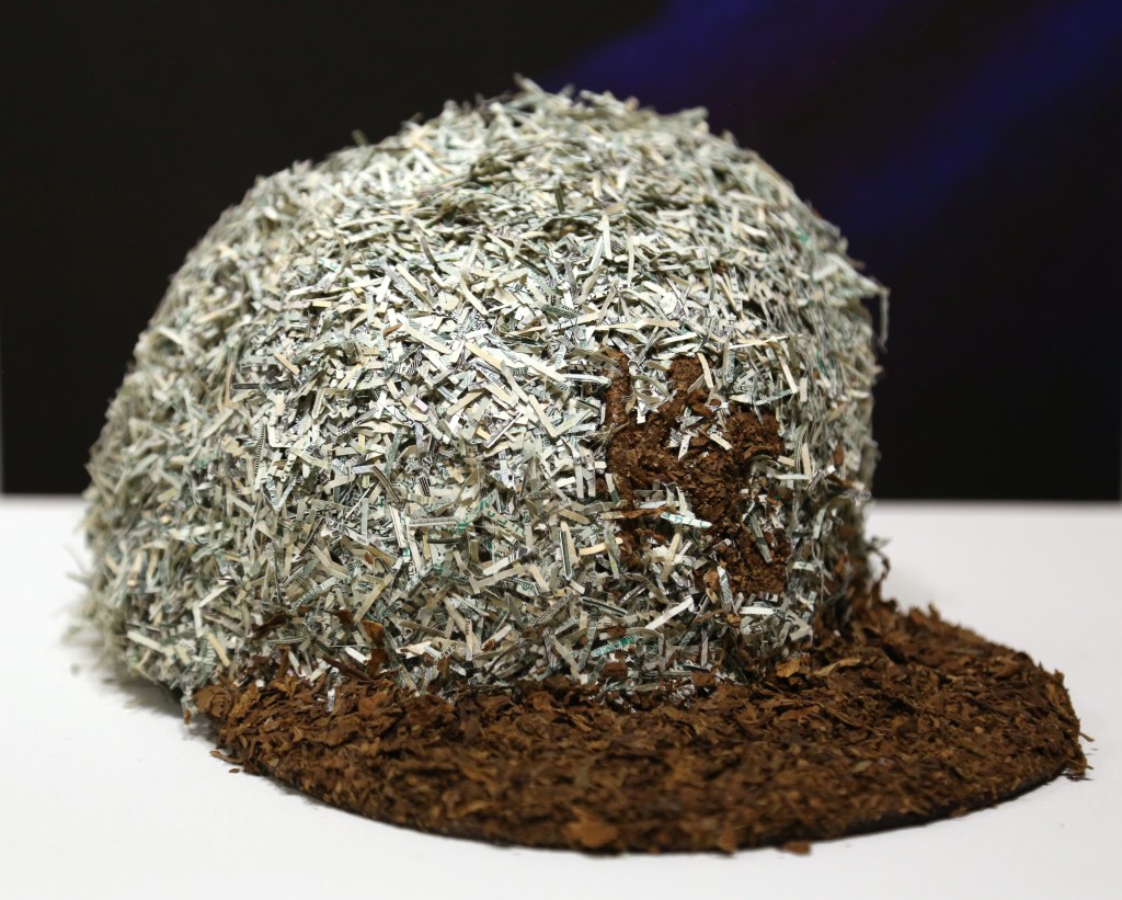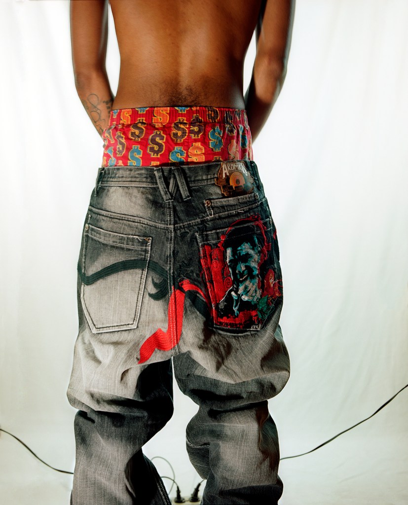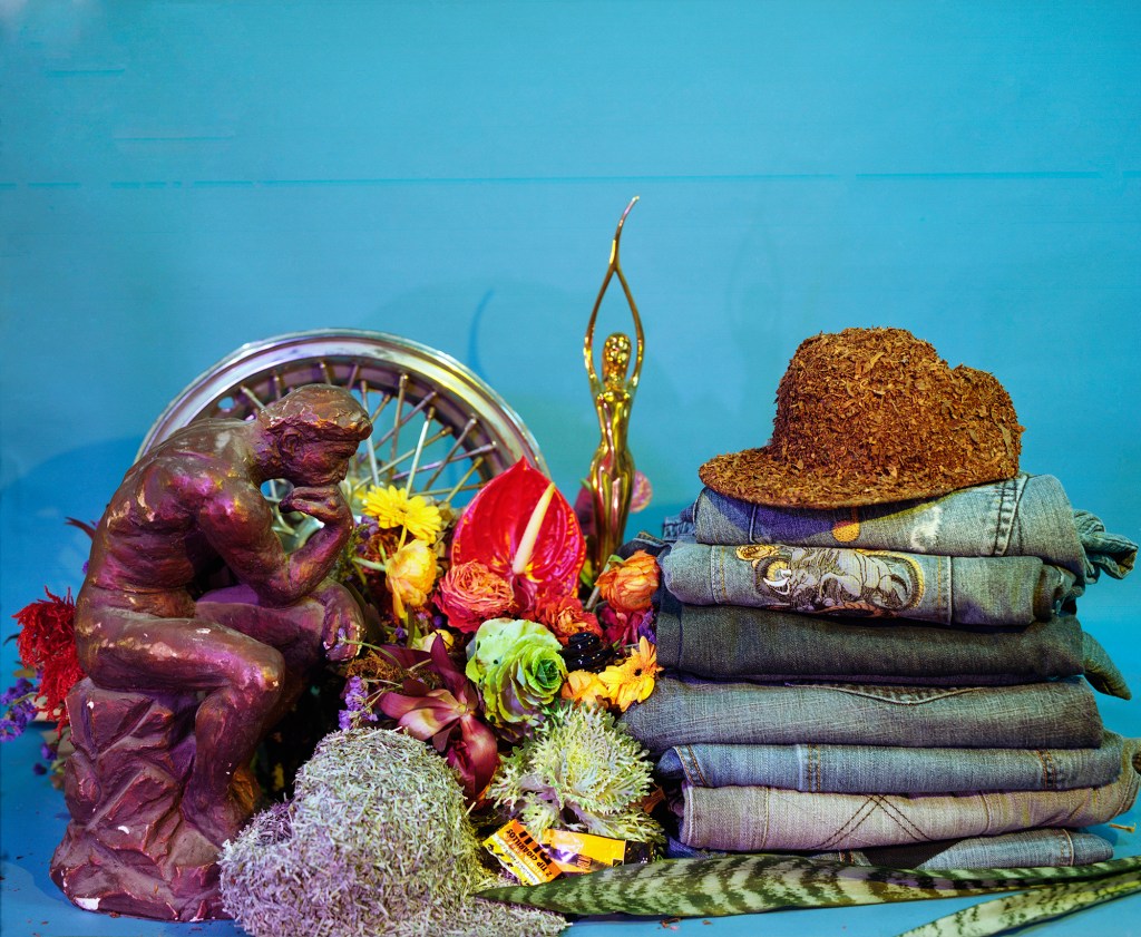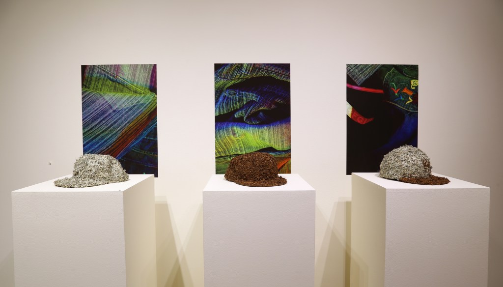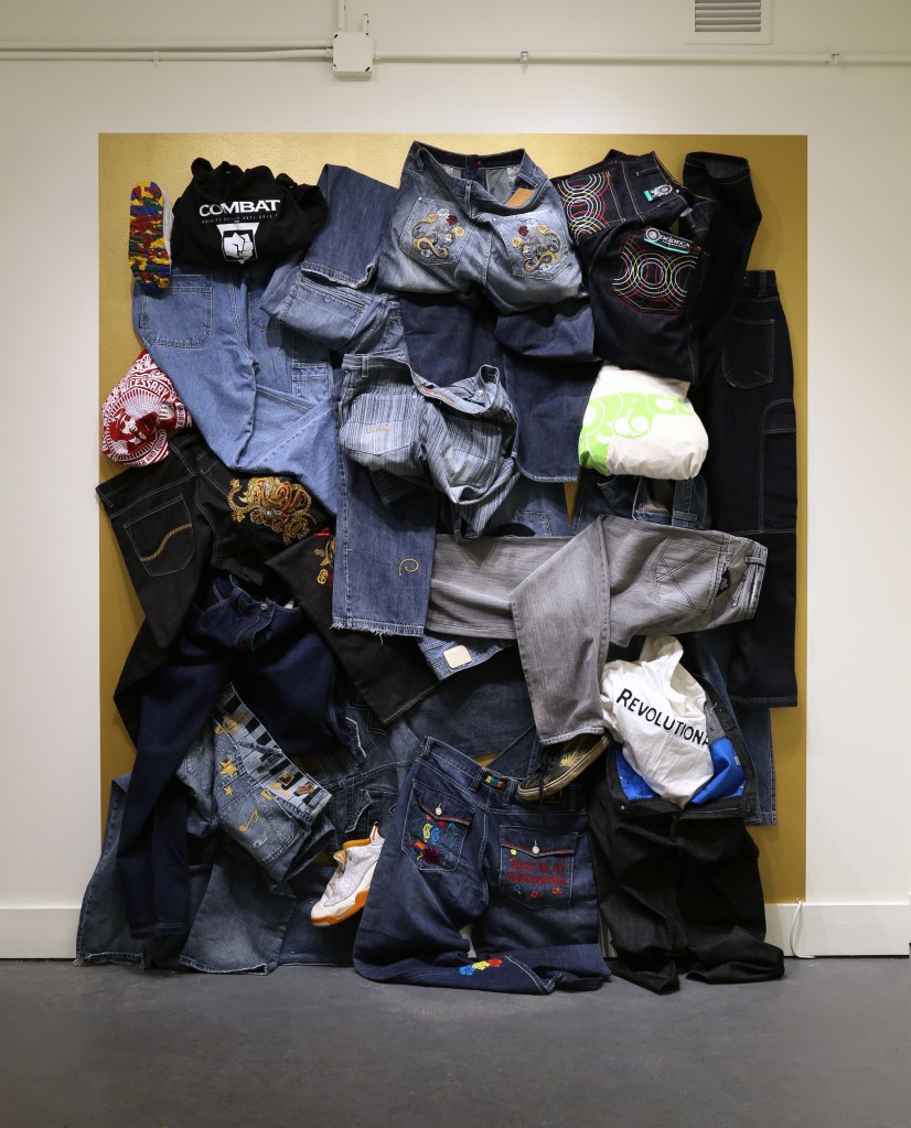 In this exhibition, I use photography, installation, and assemblage sourced from a combination of found and personal materials. Objects selected from my local environment become key components in compositions that represent a lived experience. The convergence of materials, such as denim, cotton, and tobacco, refer to their troubling presence in American history, while maintaining the celebratory status of their more current position in popular culture and fashion. My previously worn clothing, now somewhat outdated and oversized, has become an artifact of a particular moment in Black consumerism when it was popular to wear name brand clothing that was meant to be read. The message on them was often overtly political. Signifiers, motifs, and stereotypes associated with popular urban culture are used to question their position as status symbols. In a short period of time, the importance of expressing one’s “wokeness” verbally and politically has amplified, yet the fashion trends have become more subtle. The work in Social Fabric attempts to reclaim power by demanding to be seen in a different context, using personal narrative and shared history to describe the changing trends in the ongoing pursuit of representation and equality.