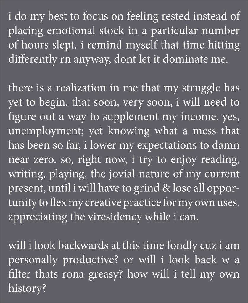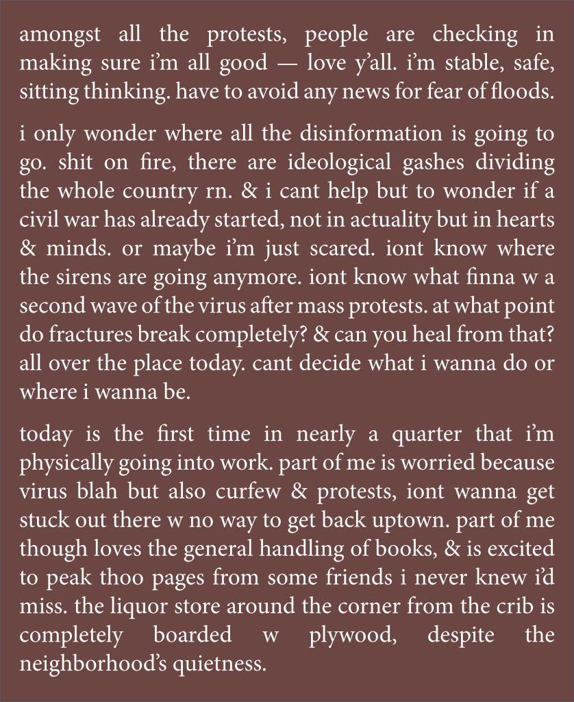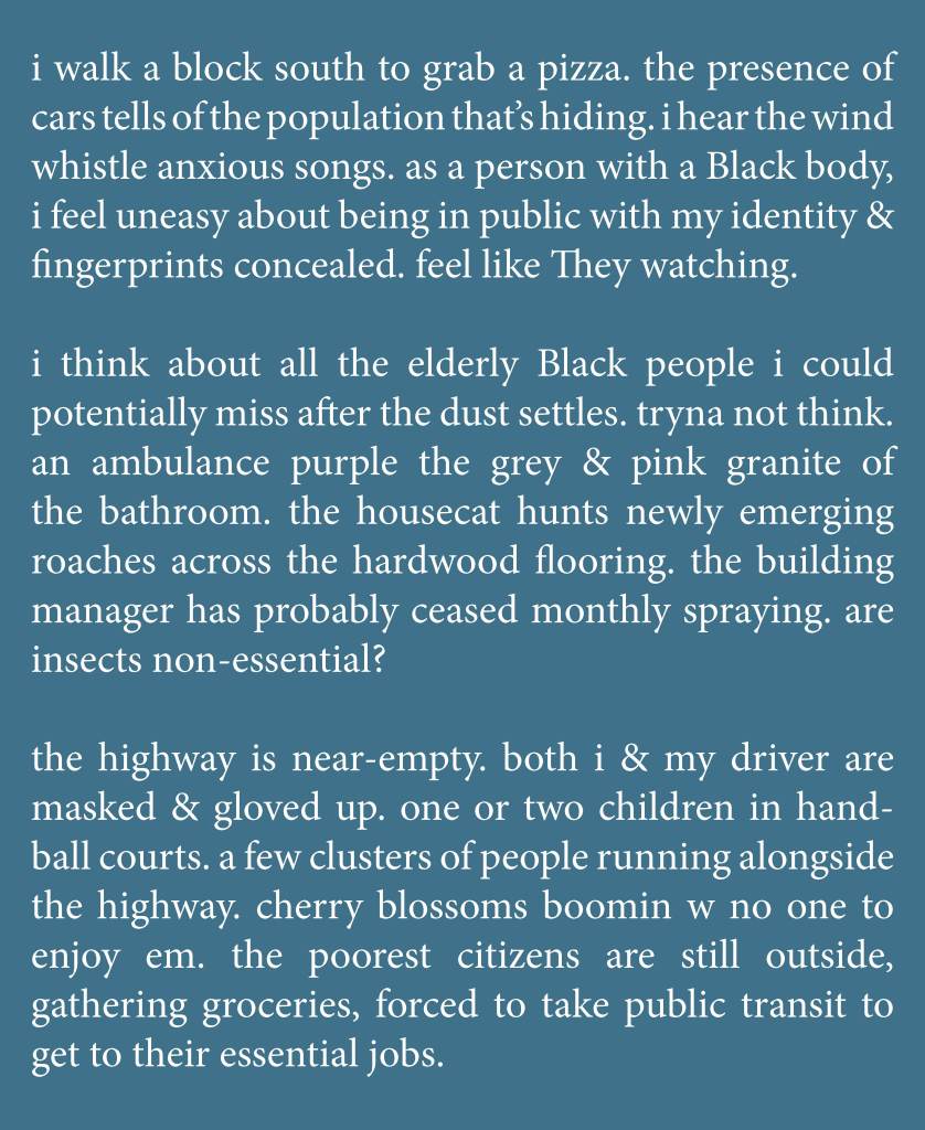 In response to the prompts in the open call, as well as the work he reviewed, marcus scott williams shared his covid-era freestyle writings called “some life indoors.” He is making the full text available (link coming soon), but you can swipe through here to get a glimpse into the daily life of this NY-based writer as he navigated the pandemic and attempted to create a safe space at home.