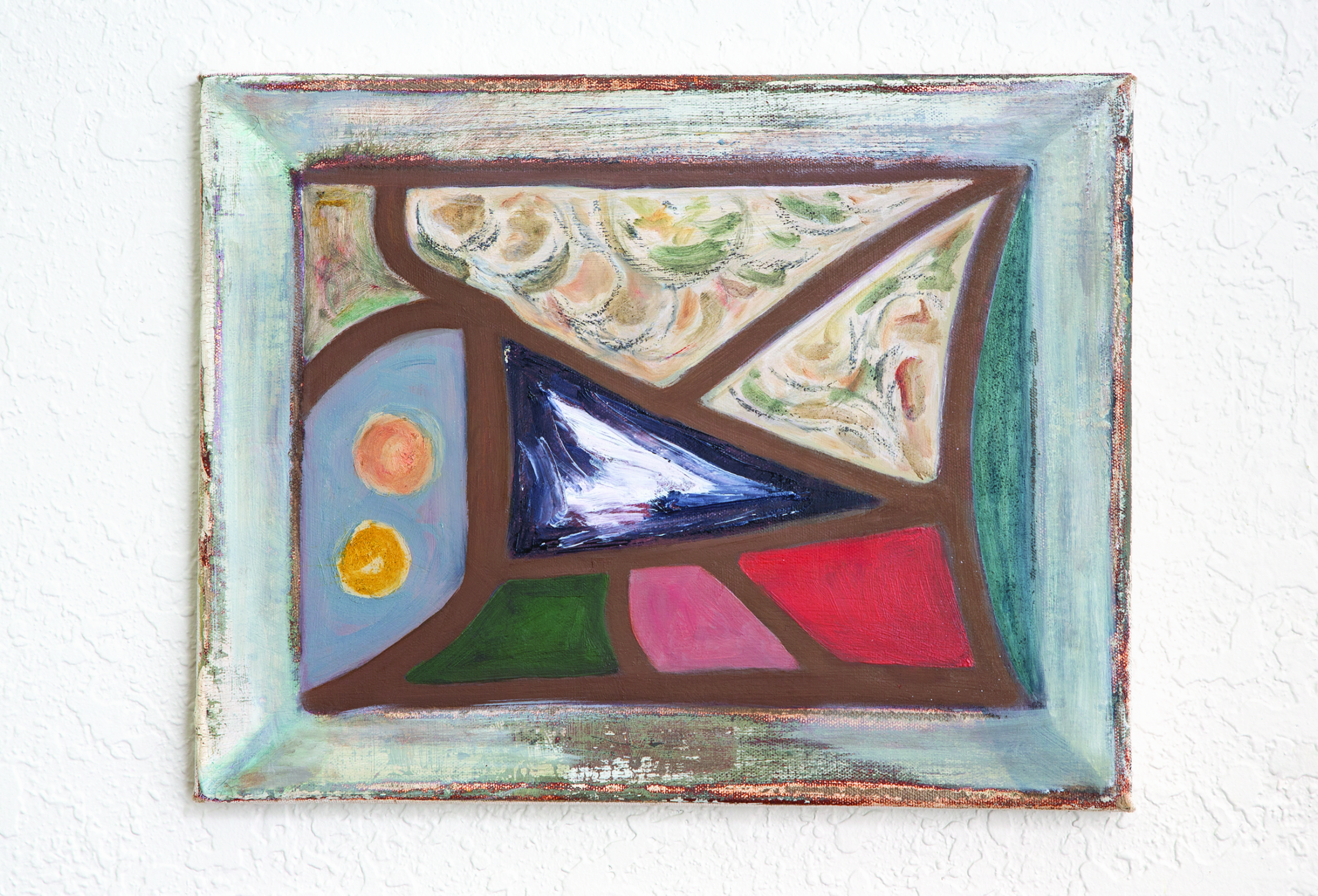 My drawings and paintings can suggest windows into elusive spaces. Abstracted lines divide and cross within the composition. This framework of space can be concrete or cloudy, worked over or quickly defined. In the paintings negative spaces are filled in with layered colors recalling Gothic stained-glass windows. Oddly familiar forms emerge or are blocked out, expressing things seen through my lived experience.